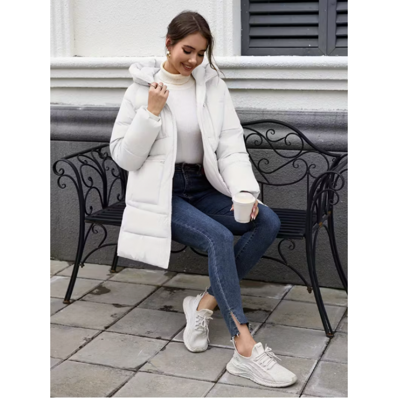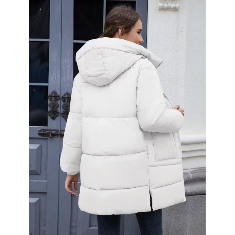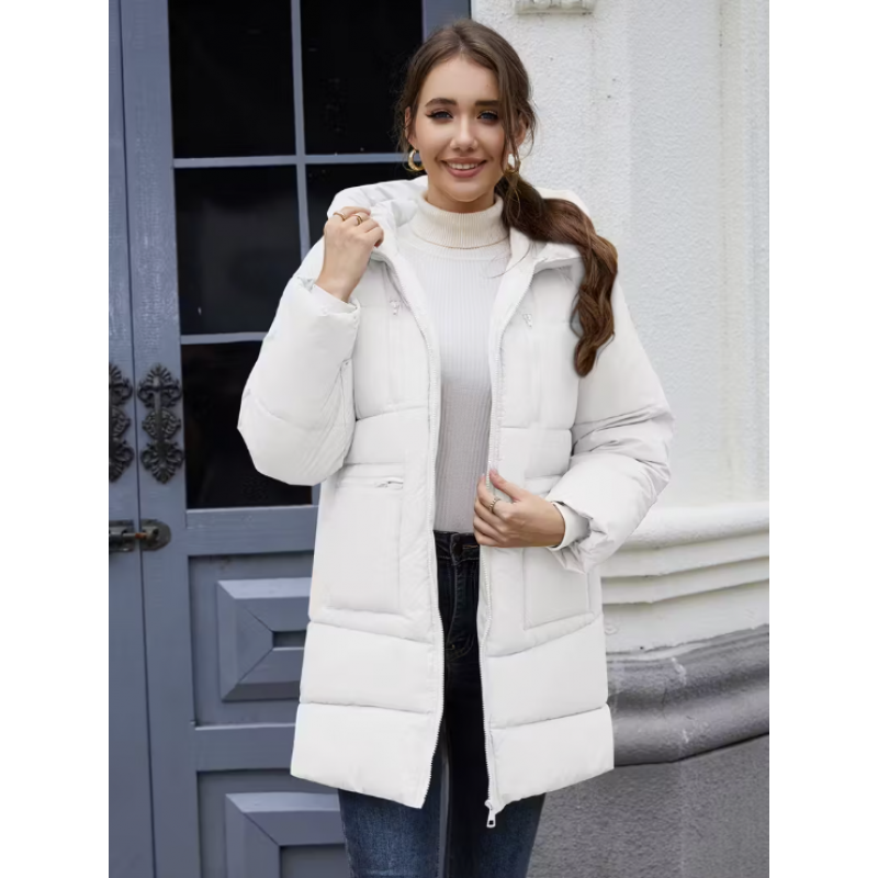 Women's thick windproof hooded down jacket - A warm and cozy winter coat with zipped pockets, stand-up collar, mid-length cold-weather outerwear, suitable for skiing and commuting - Elegant white coat
